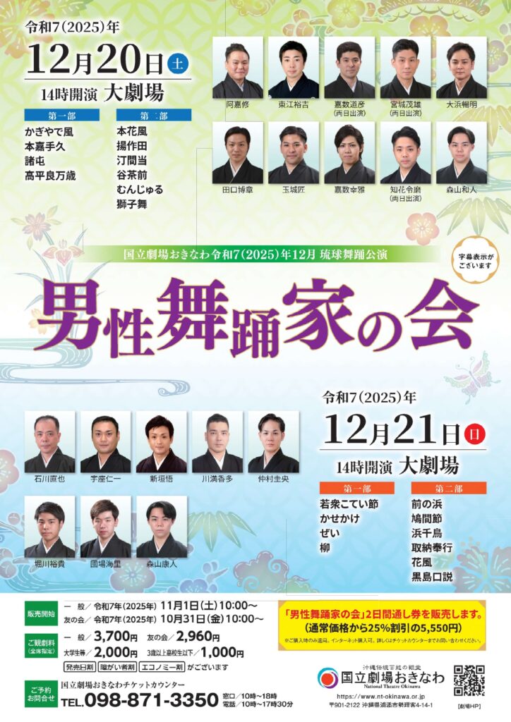毎年好評を得ている「男性舞踊家の会」。琉球舞踊や組踊をはじめ、様々な舞台公演においてその活躍が目覚ましい男性舞踊家達が一堂に集い、古典舞踊・雑踊を中心に多彩な舞踊をお届けします。男性舞踊家ならではの、魅力溢れる琉球舞踊の世界を二日間に渡ってお楽しみいただけます。ぜひ、ご期待ください。