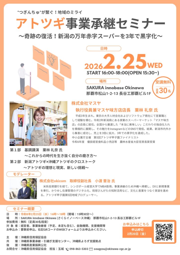 沖縄県信用保証協会では、事業承継に関するアトツギ事業承継セミナーを開催いたします。