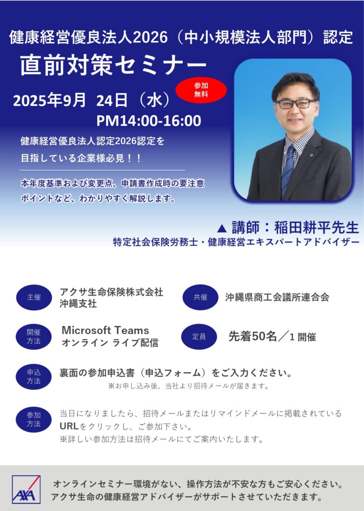 当セミナーでは健康経営優良法人(中小規模法人部門)の申請に向けて、健康経営エキスパートアドバイザーの稲田耕平先生に申請のポイントについて解説いただきます。