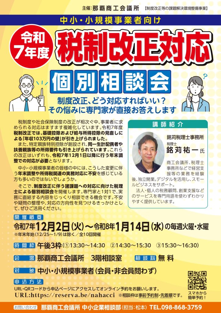 そこで、制度改正に伴う諸課題への対応に向けた税理 士による個別相談会を開催します。専門家と1対1で、実務に直結する内容をじっくり相談できる機会です。不安や疑問の整理や、対応の方向性を見つけるきっかけとして、ぜひご活用ください。