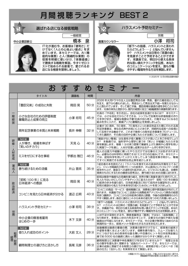 那覇商工会議所では会員事業所様サービスとして、Webセミナーを配信しております(非会員事業所様は有料)。 経営力向上や、従業員の資質向上等にぜひご利用ください。