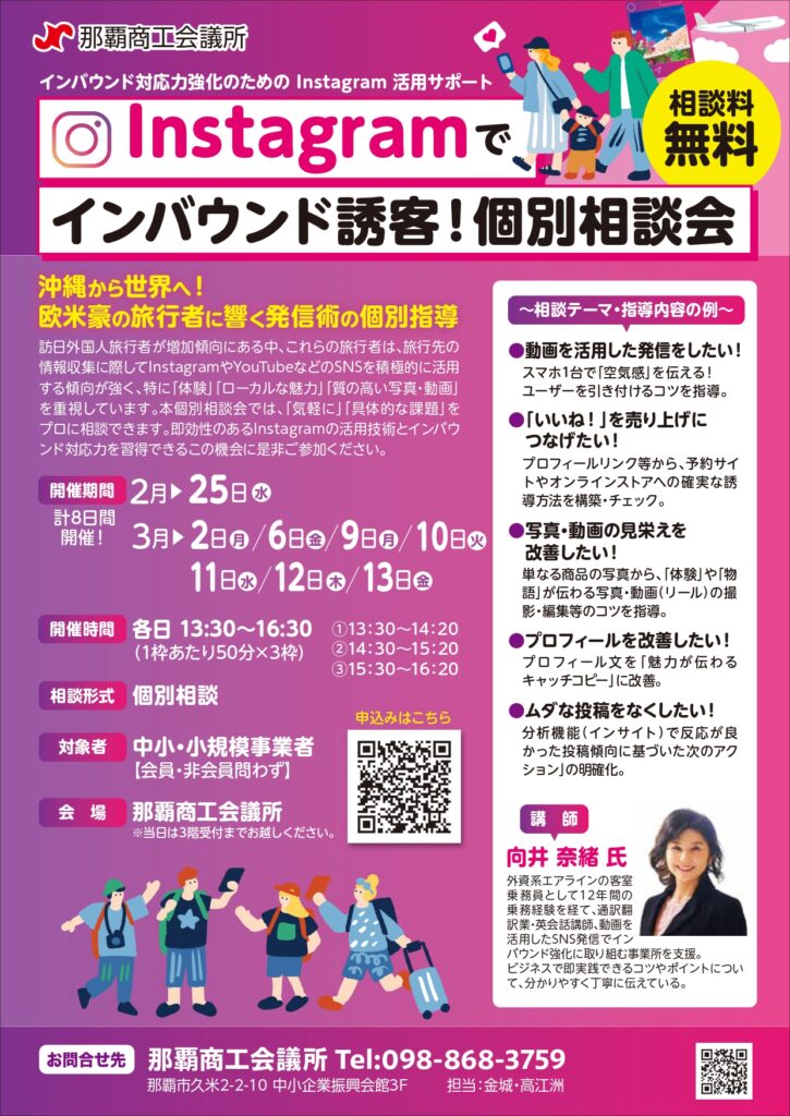 訪日外国人旅行者が増加傾向にある中、これらの旅行者は、旅行先の情報収集に際してInstagramやYouTubeなどのSNSを積極的に活用する傾向が強く、特に「体験」「ローカルな魅力」「質の高い写真・動画」を重視しています。本個別相談会では、「気軽に」「具体的な課題」をプロに相談できます。即効性のあるInstagramの活用技術とインバウンド対応力を習得できるこの機会に是非ご参加ください。